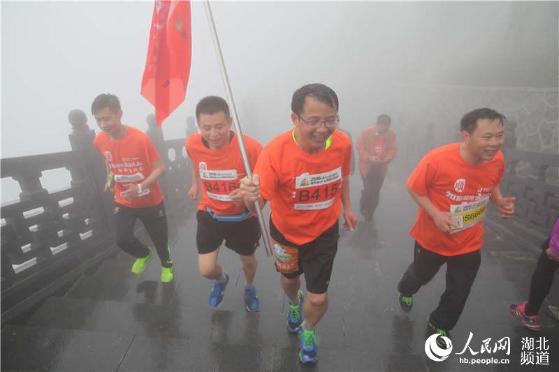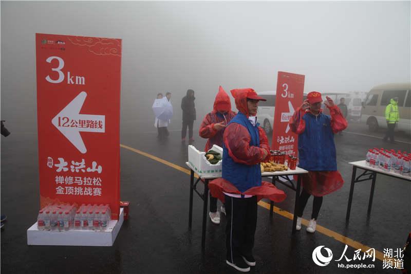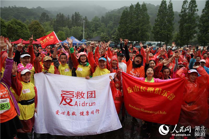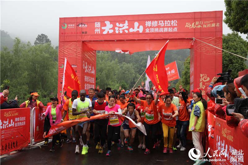 人民网武汉5月9日电 (董行)8日,湖北首届禅修马拉松在随州大洪山风景区开跑,千名跑友冒着绵绵春雨,沿着蜿蜒的山间公路一路登顶大慈恩寺。