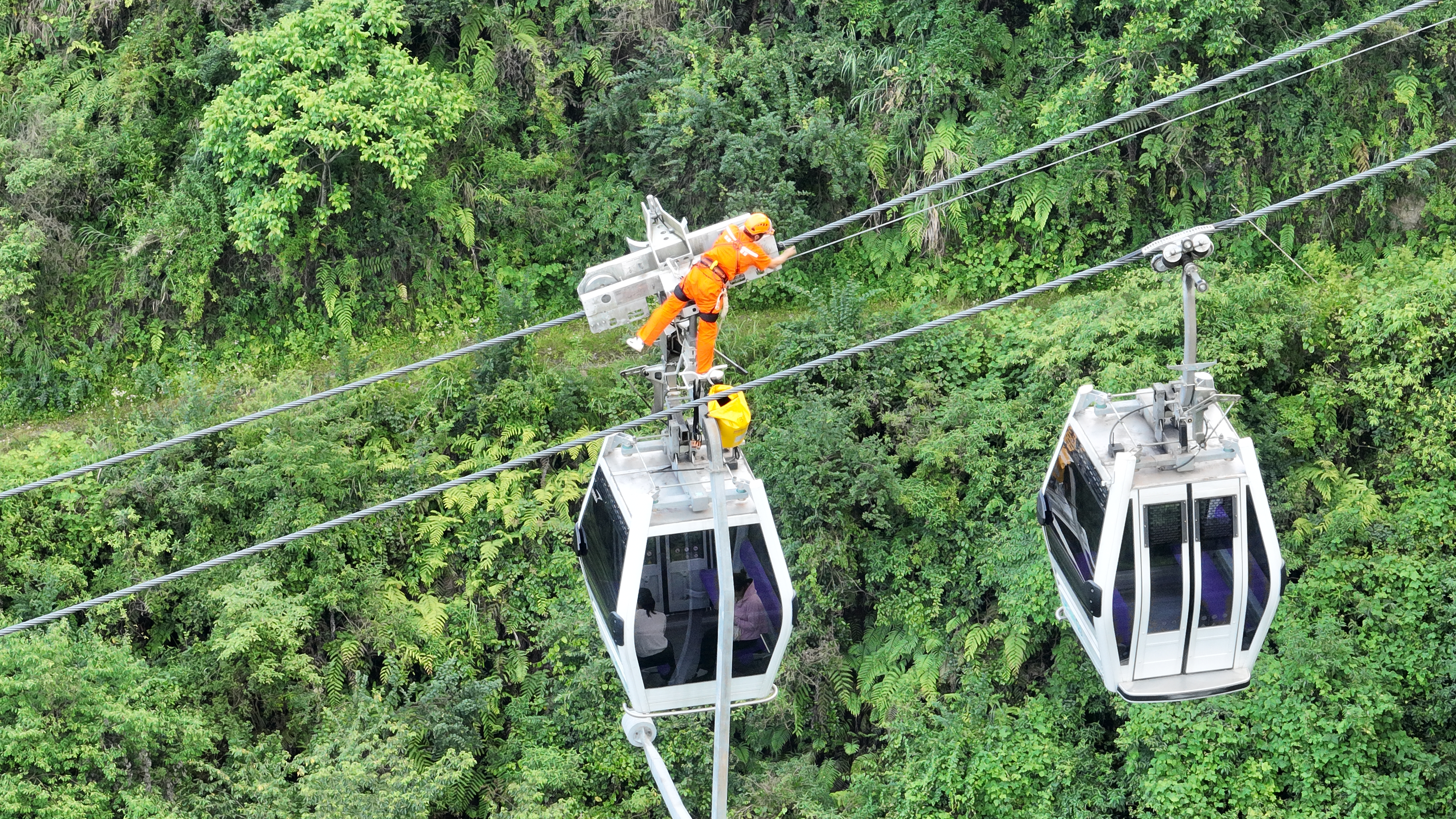 本次演练科目涵盖客运索道高空水平救援及垂直救援,模拟索道突发机械故障停车,并有游客滞留在多个吊厢内等待救援的情形。接到救援指令后,恩施大峡谷索道立即启动应急预案,各方力量迅速集结。操作人员熟练运用水平救援设备,高空救援操作人员与地面接应人员分工明确、配合默契。