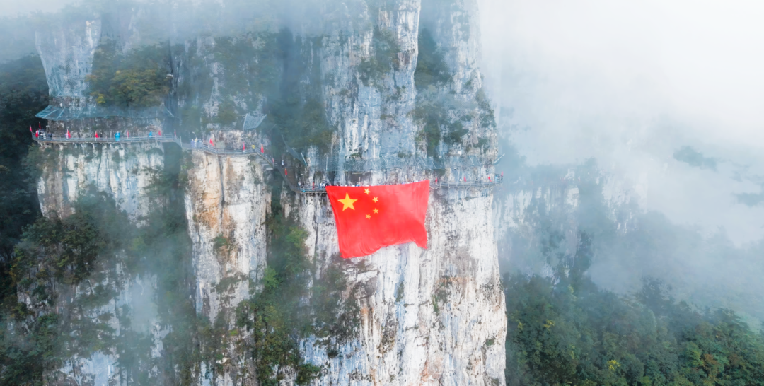 与此同时,七星寨绝壁栈道上,一面巨幅国旗在巍峨绝壁间徐徐展开,这一壮观景象引得游客纷纷驻足仰望。