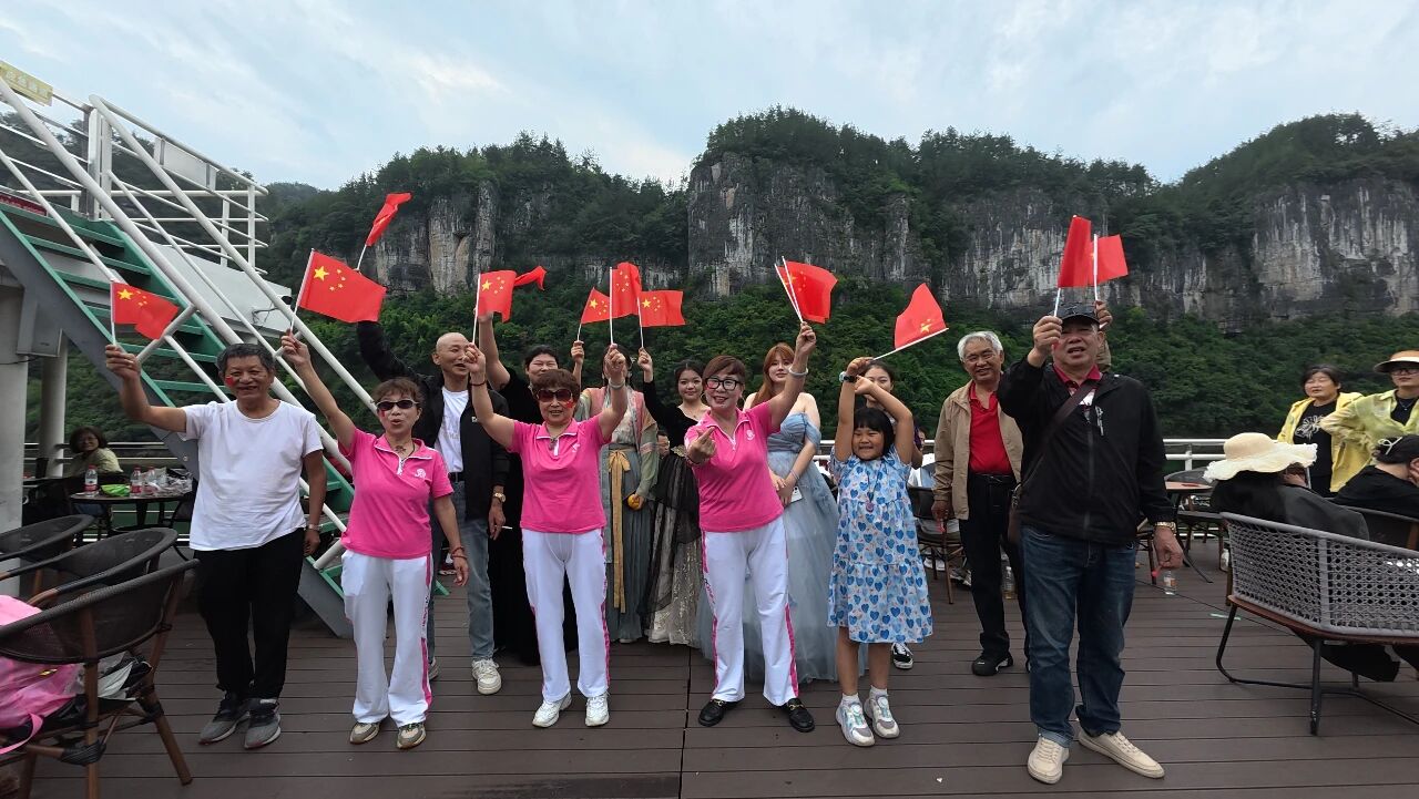 随后开展的"万人合声《我和我的祖国》"活动,引发众多游客挥动国旗自发跟唱,嘹亮歌声与峡谷回声交织,现场气氛热烈,游客参与热情高涨。