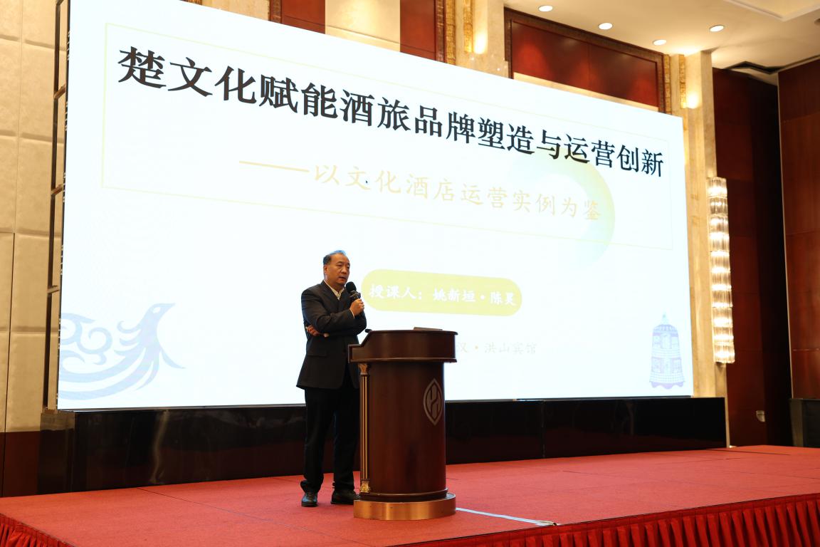 集团特级资深专家顾问姚新垣为学员们讲授了本次集中培训的第一课《楚文化赋能酒旅品牌塑造与运营创新》,从文化定位、服务体验、营销传播等方面,结合国内外知名文化主题酒店及洪山宾馆文化改造的案例,深入阐释了地域文化与酒店品牌融合的路径与方法,为学员们提供了将文化资源转化为品牌价值的实践指南。集团景旅事业部高级经理陈昊现场分享了楚文化的内涵和应用案例。