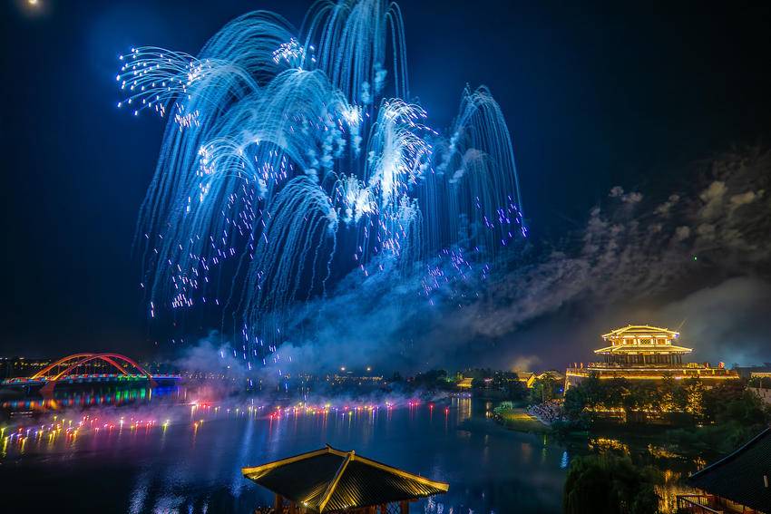 科技与艺术交织,夜空绽放爱国情怀。嘉年华期间,数百架无人机联袂焰火打造视觉盛宴。夜幕中,无人机方阵变幻出“五星红旗”“我爱中国”等图案,配合“蓝色马尾”“七彩祥云”等特效烟花,为游客呈现了一场沉浸式的光影艺术盛宴。据悉,该演出将于10月1日至6日每晚20:50准时上演,水广场、仙女台、见南阁、进士殿等地为最佳观赏点。