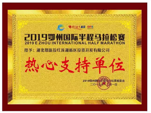 受鄂州市政府邀请,鄂旅投红莲湖公司组织人员参与支持此次2019鄂州国际半程马拉松赛,并被授予“热心支持单位”。