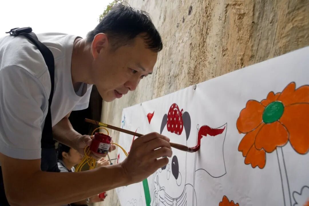 活动现场铺设的长卷以"锦绣中华"为主题,设置了多个绘画区域。游客们自发参与创作,或调色勾勒,或细心描绘,共同在长卷上绘制五星红旗、祥云、火箭等象征国家发展的图案。