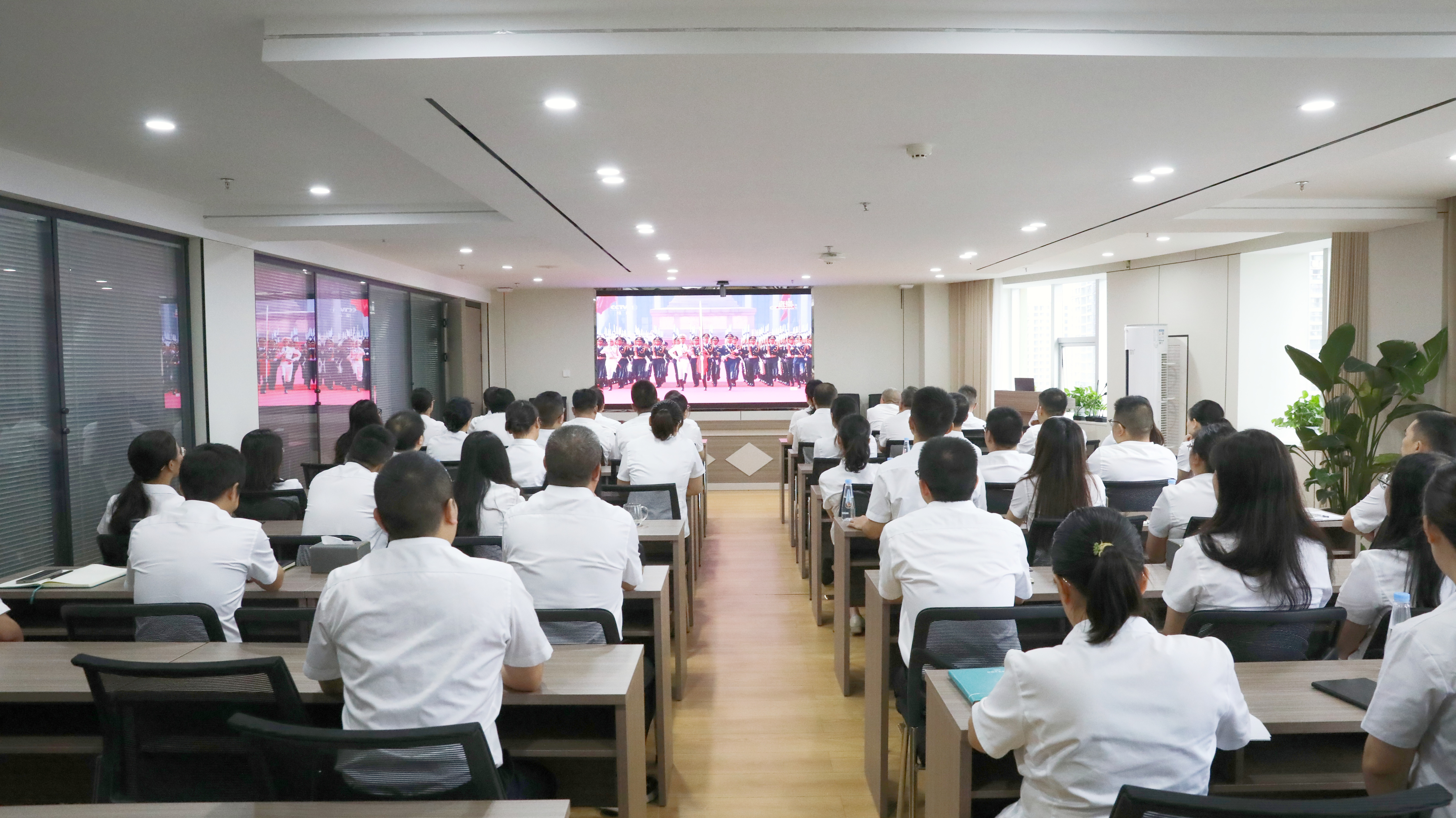 全体干部职工通过直播观看了整齐划一的徒步方阵、彰显国威的装备方阵等阅兵环节,沉浸式感受国威军威,领略祖国的强大与荣耀。