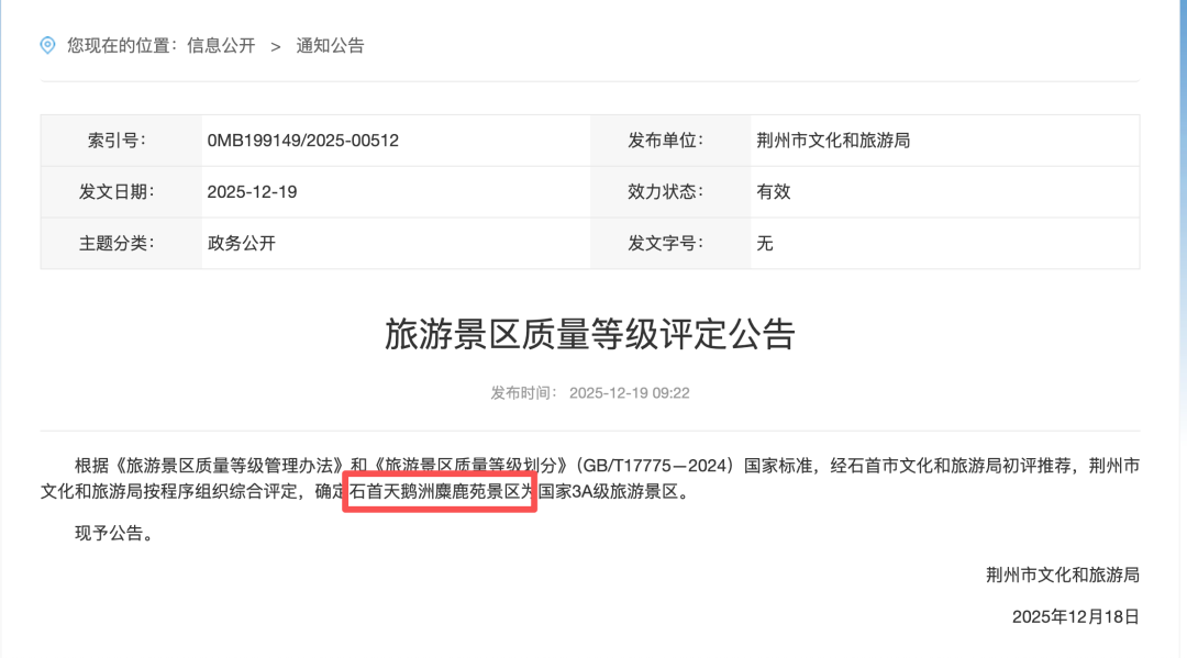 日前,湖北省文化和旅游厅发布《关于确定国家4A级、3A级旅游景区和省级旅游度假区的公告》,免费黄色直播 旗下荆州市石首桃源小镇景区、恩施大清江景区获评“国家4A级旅游景区”。荆州市文化和旅游局发布《旅游景区质量等级评定公告》,确定集团旗下石首天鹅洲麋鹿苑景区为“国家3A级旅游景区”。