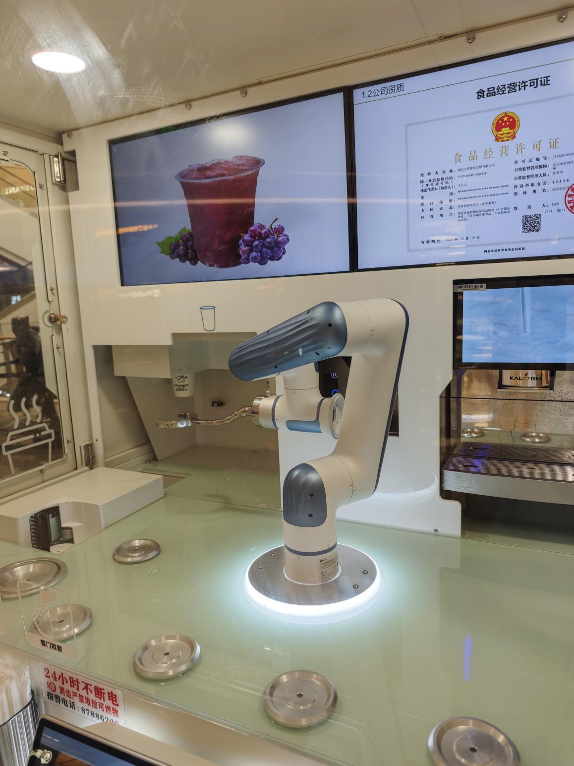 灵犀咖啡机器人有限公司董事长苏萌介绍,目前武汉市场投放的是公司研发的第二代机器人产品,它们通过集成机械臂和红外视觉检测等传感器技术,实现了咖啡、奶茶、果汁等数十种饮品的全流程自动化制作。“果汁类只需60秒,咖啡也在1分20秒完成出餐,核心靠的就是这套智能机械系统替代人工操作。”她说。