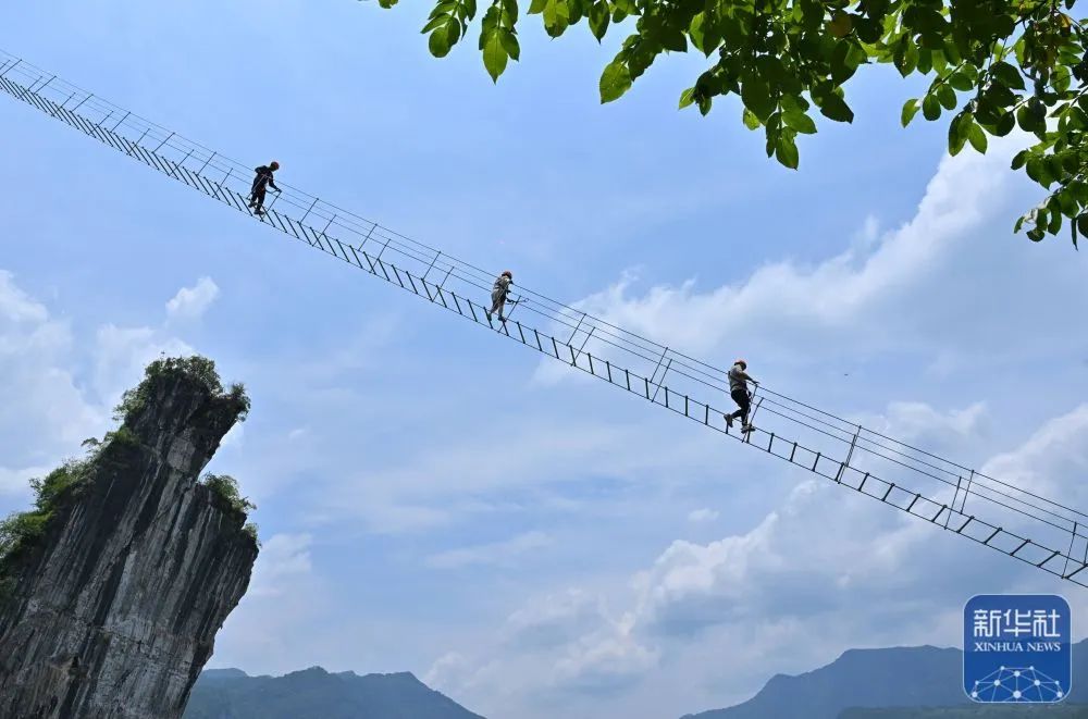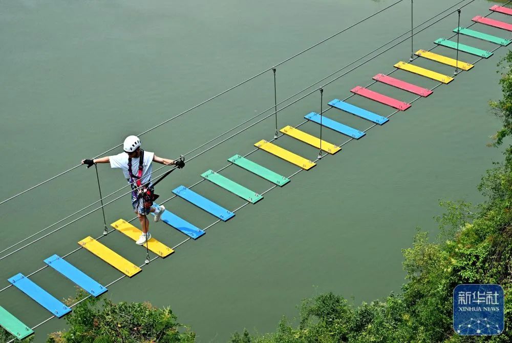 湖北省恩施市新塘乡红花峰林景区,游客在体验“彩桥”项目新华社发(宋文摄)