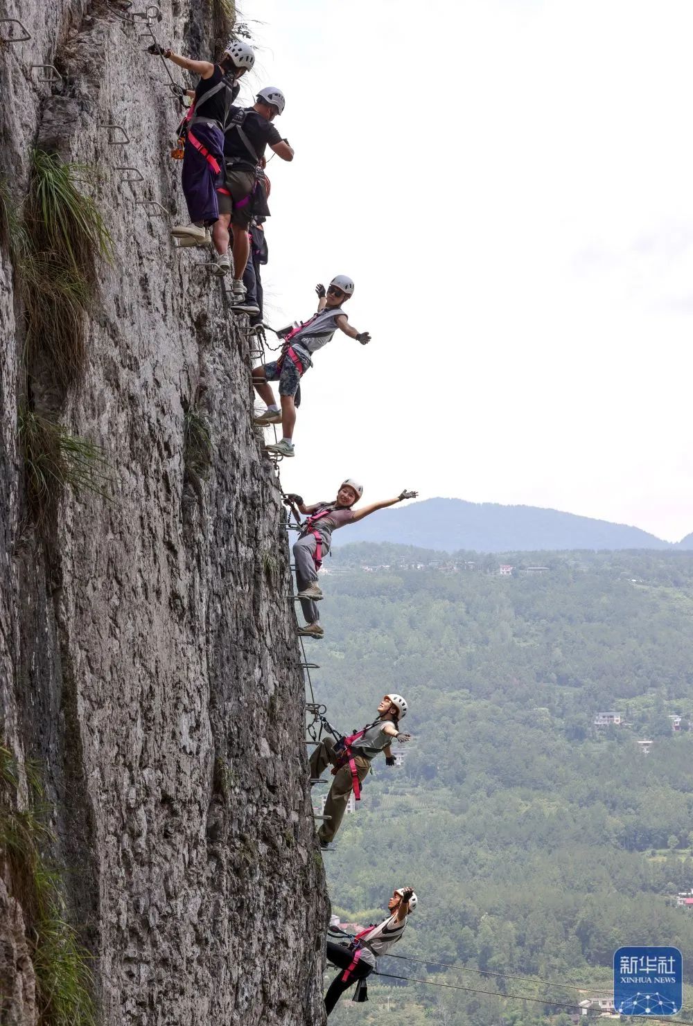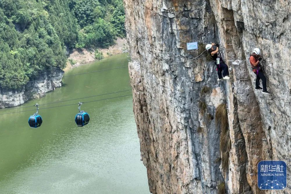 湖北省恩施市新塘乡红花峰林景区,游客在体验“飞拉达”攀岩项目。新华社发(赵军摄)