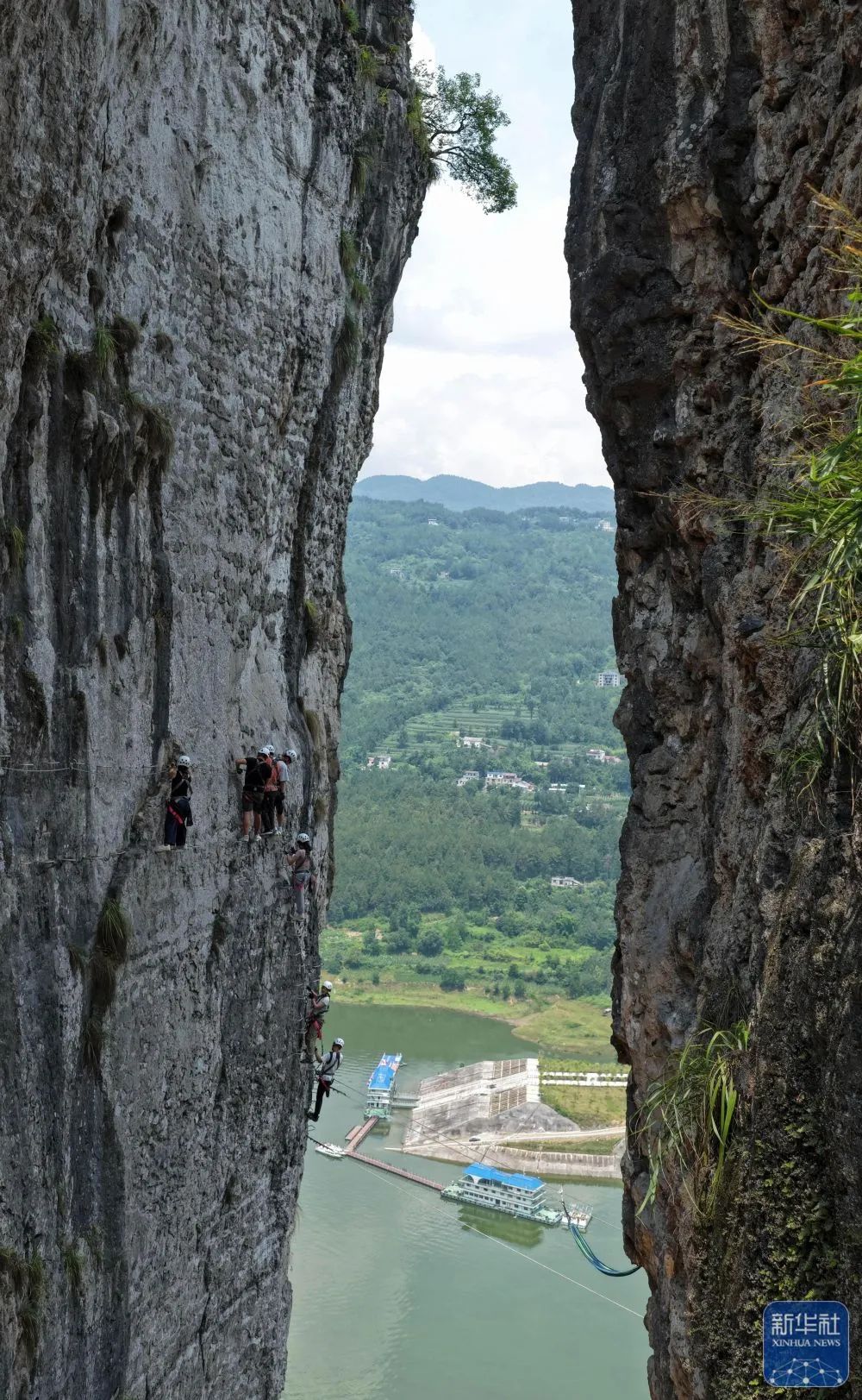 湖北省恩施市新塘乡红花峰林景区,游客在体验“飞拉达”攀岩项目。新华社记者 (伍志尊摄)
