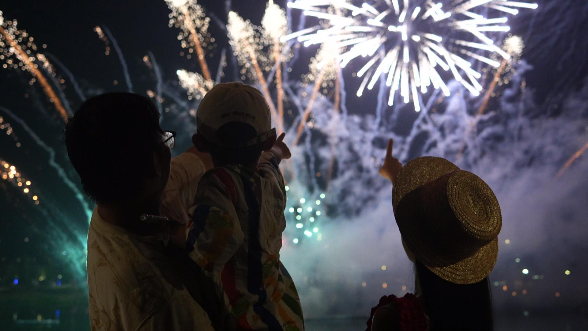 夜幕降临时,无人机焰火秀更是成为重头戏,百架无人机在空中变换出“五星红旗”“我爱你中国”等图案,与绚丽的焰火交相辉映,让现场观众叹为观止。