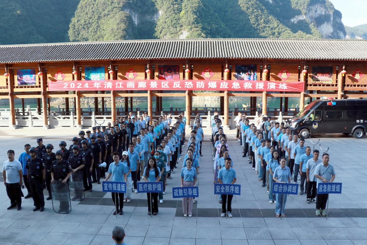 此外,清江画廊景区还高度重视其他类型的安全生产应急演练。在之前的安全生产月中,开展了水上船舶碰撞进水堵漏、游客落水救援和游客疏散等多个科目的应急演练,8月27日又开展了一期非遗剧场消防灭火和观众疏散应急演练。通过此类演练,进一步增强了员工的安全意识和应急处理能力,为景区的安全运营提供了有力支持。