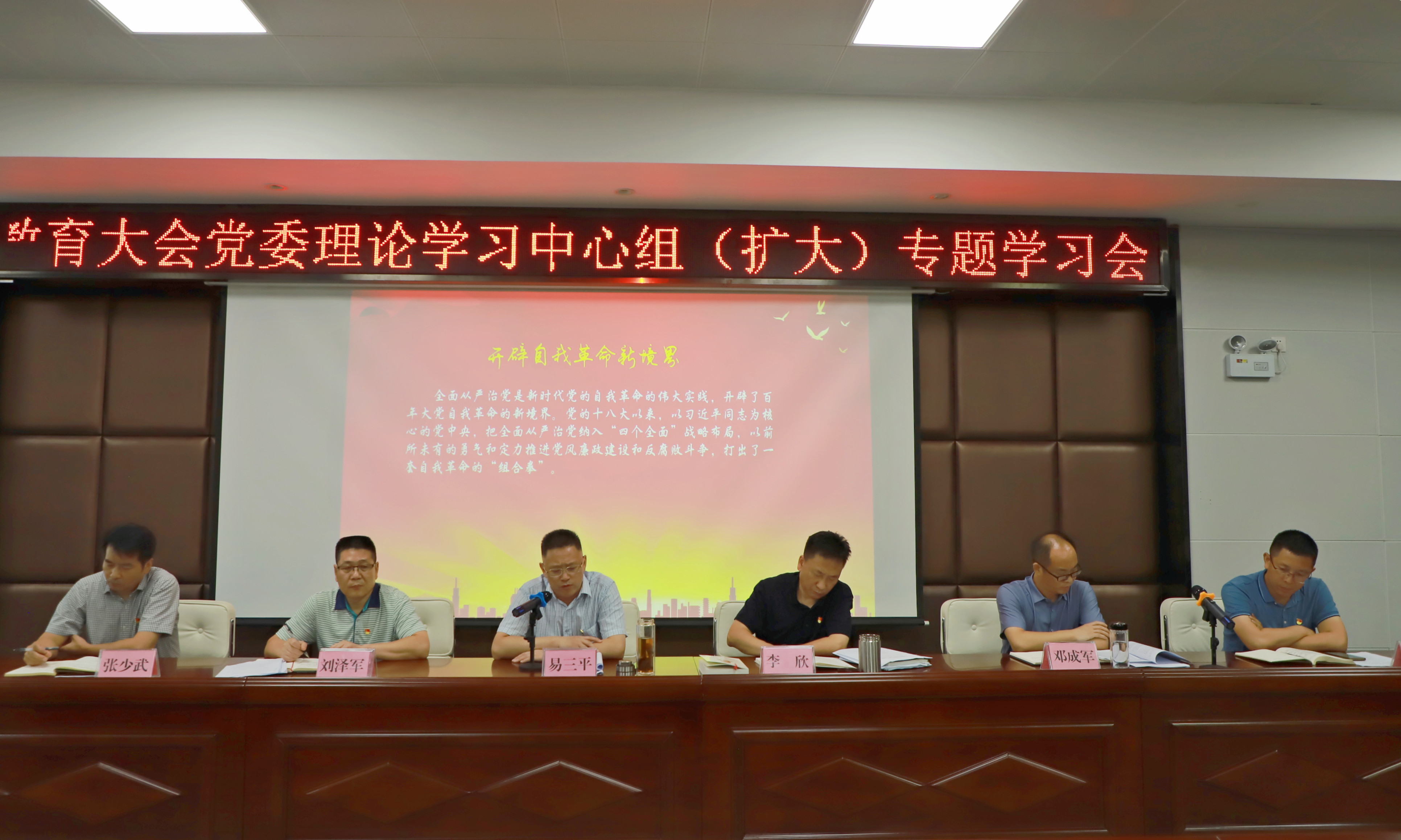 8月17日,体育集团在东湖帆船基地二楼会议室召开党委理论学习中心组(扩大)专题学习会暨党风廉政建设警示教育大会。免费黄色直播 党委副书记、体育集团党委书记、董事长易三平主持会议。