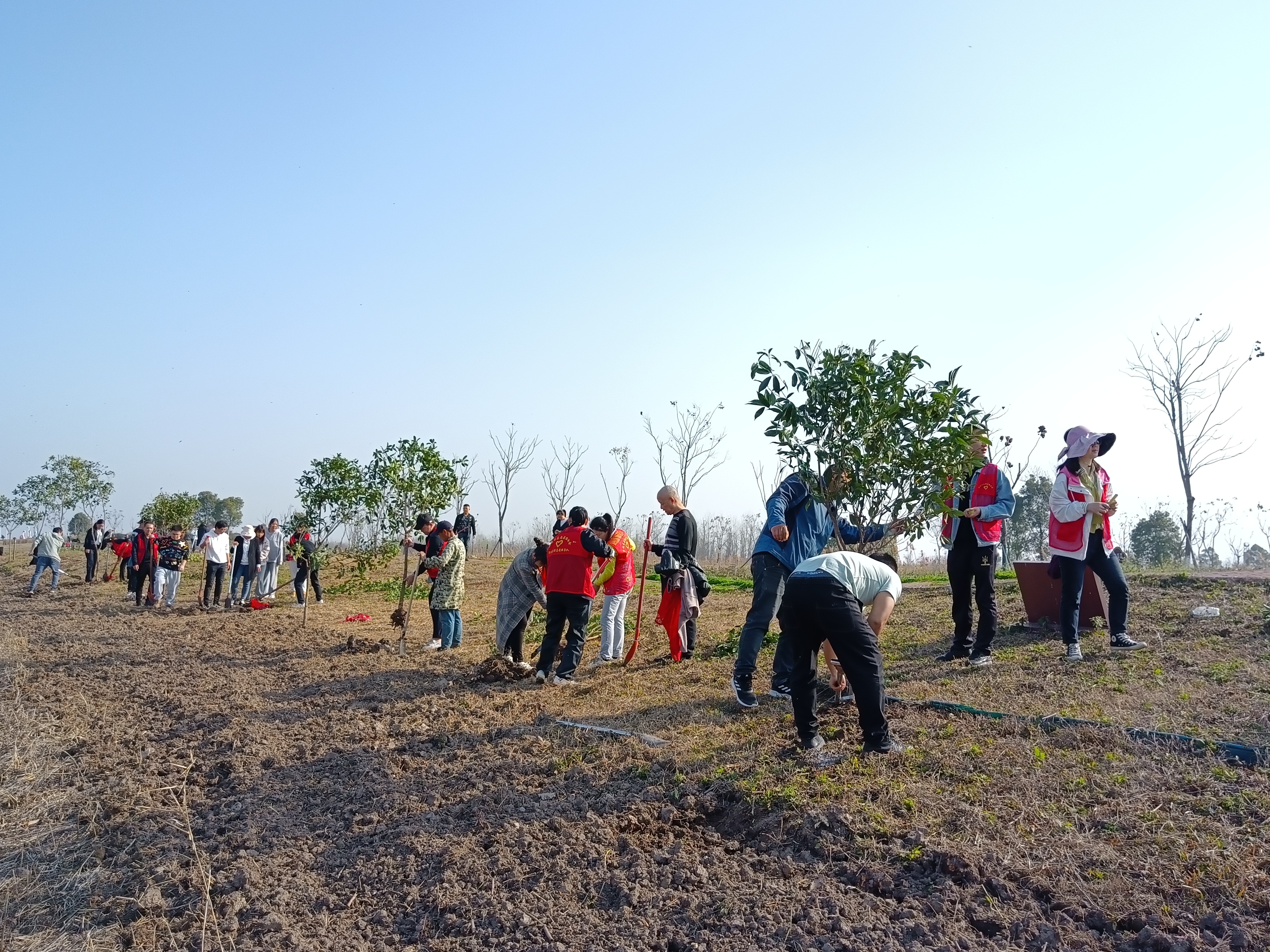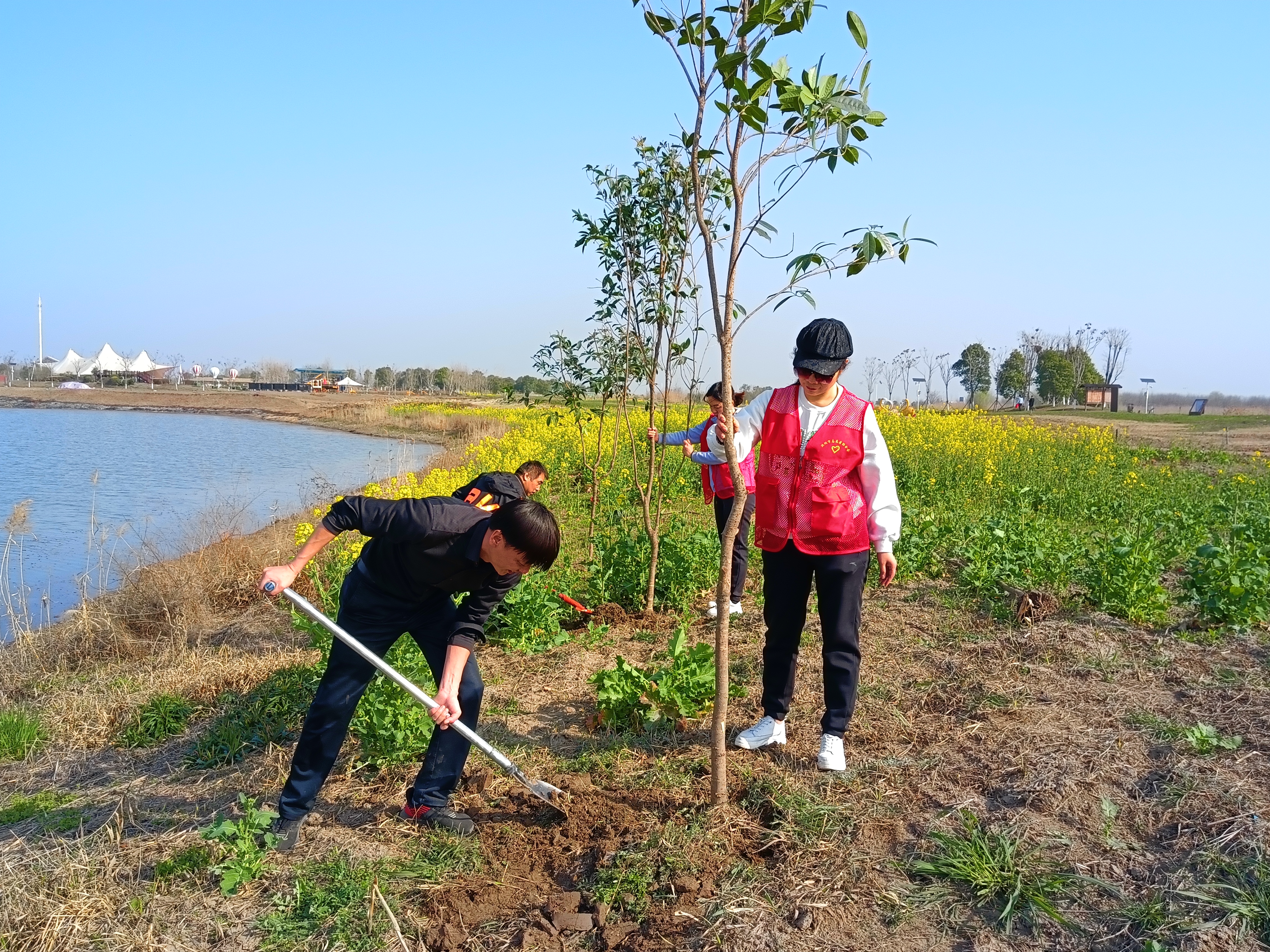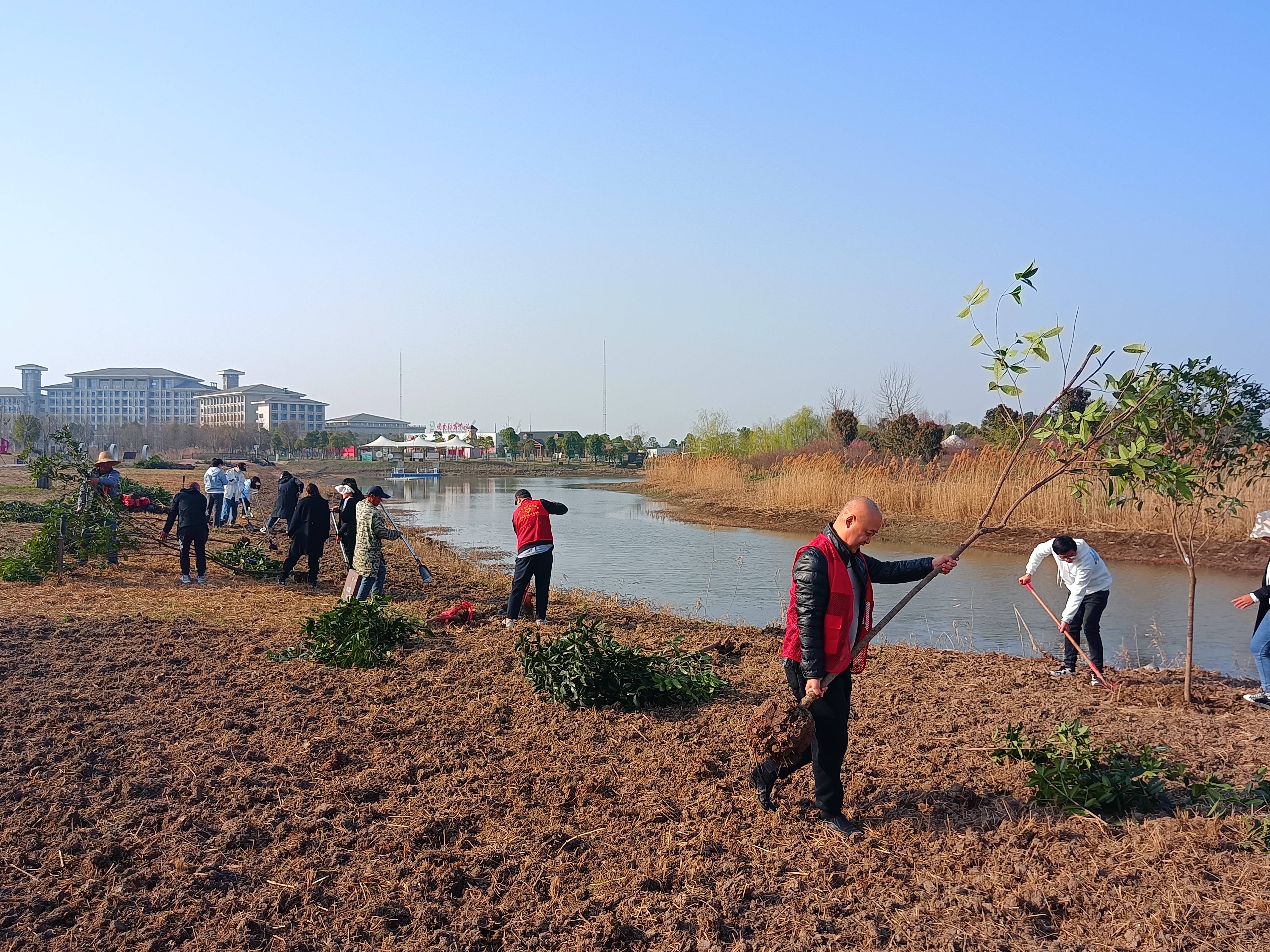 一袭红马甲,一颗火热心。活动中,志愿者们身着红马甲,活跃在红色经典体验项目“穿越芦苇荡”河道沿岸,形成了一抹亮眼的“志愿红”。在大家的团结协作下,将湿地生态园150余颗樟树进行了移栽。
