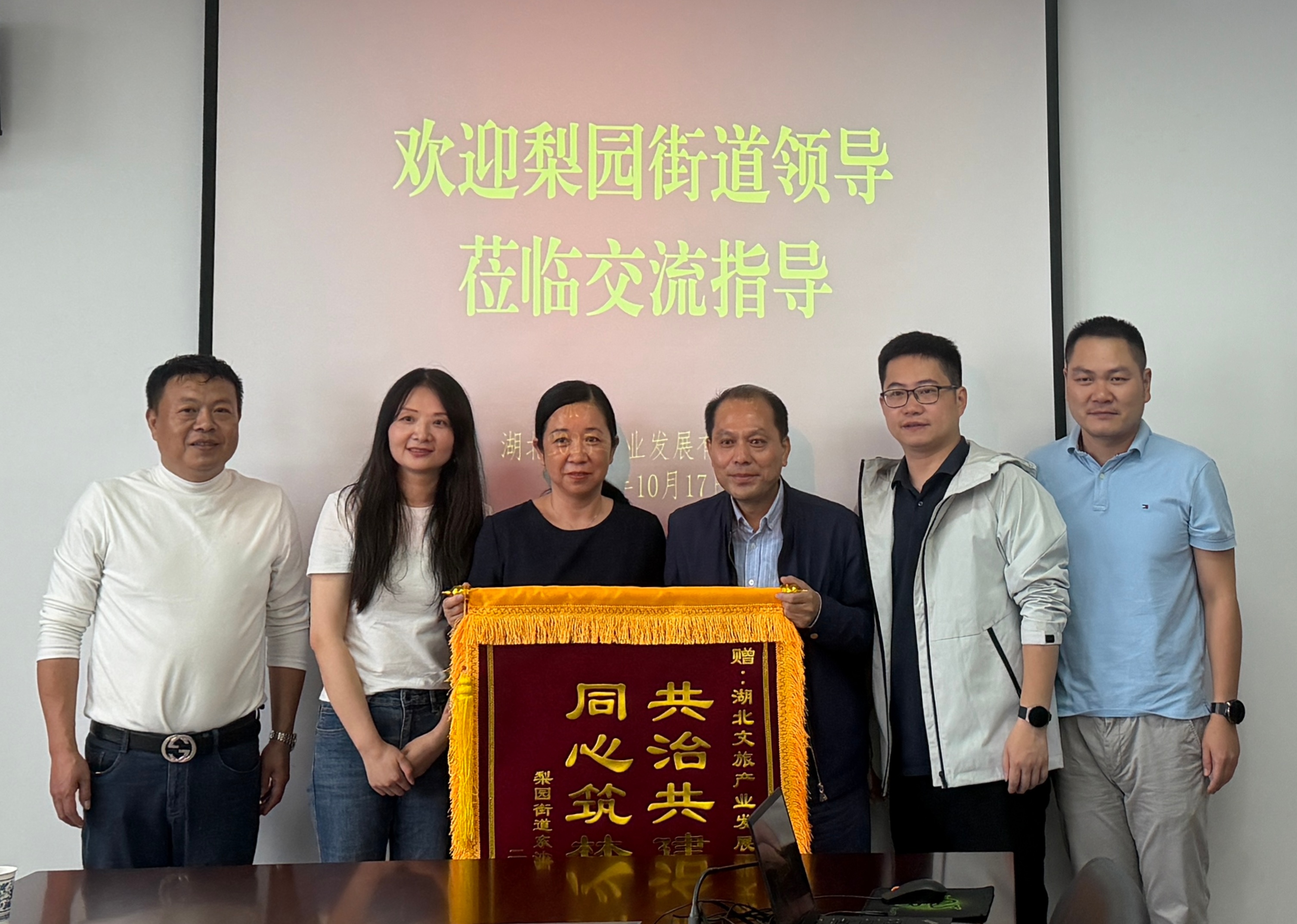 一面锦旗,一份认可,凝聚着深厚的政企情谊,承载着社区的诚挚谢意。近日,产业公司迎来梨园街道东沙花园社区的深情到访。梨园街道综合执法中心主任苏艳芳、东沙花园社区党支部书记向珺一行,专程将一面书写着"共治共建聚合力,同心筑梦惠民生"的锦旗送至产业公司,以此感谢公司在长期结对共建中,为社区治理、环境提升与民生改善作出的扎实贡献。市住房保障和房屋管理局副处长万徐、余家湖集团党委委员及东沙地产负责人喻立冬一同到访。产业公司党委班子成员及相关部门负责人热情接待并举行座谈。
