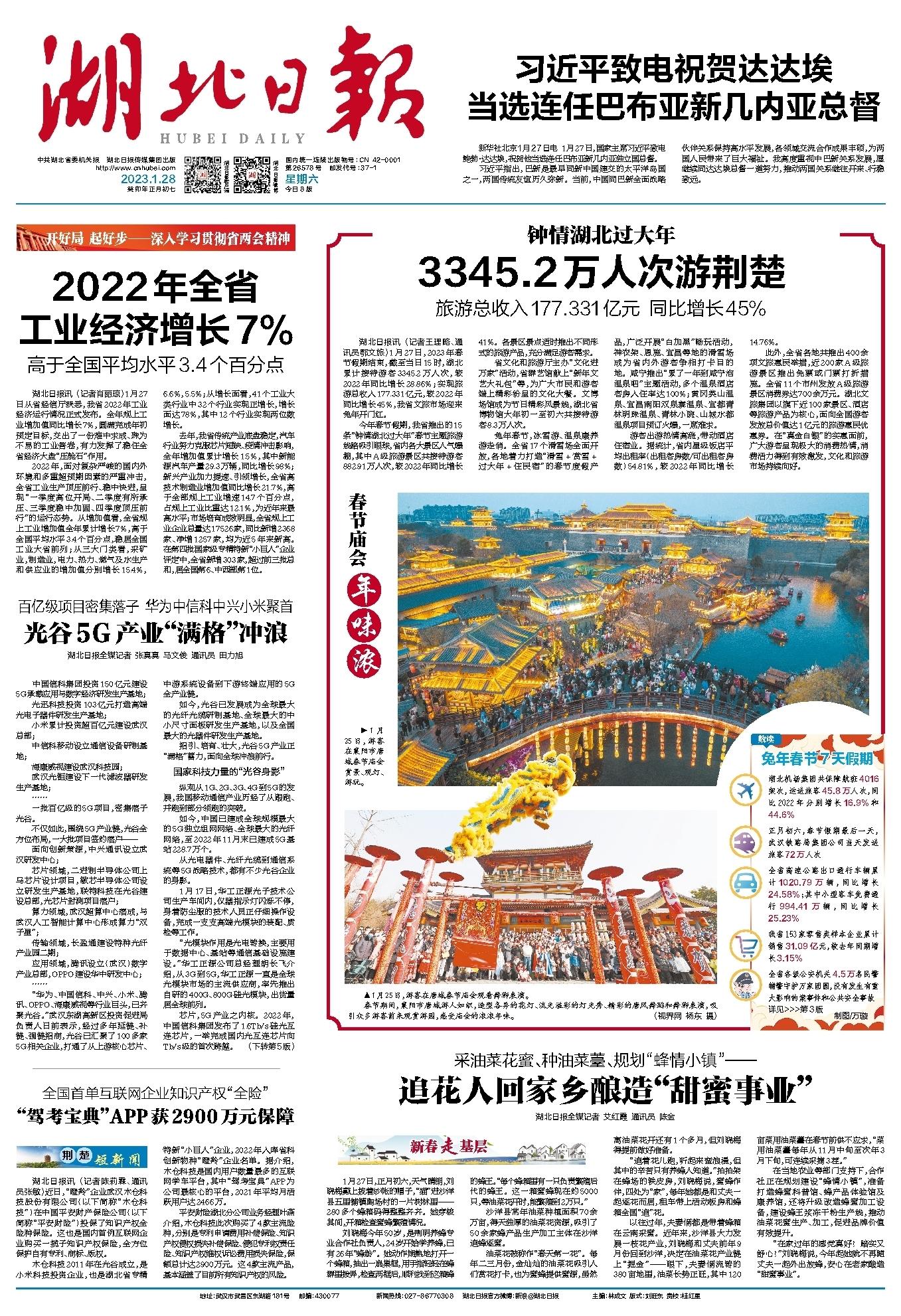 湖北日报讯 (记者王理略、通讯员鄂文旅)1月27日,2023年春节假期结束,截至当日15时,湖北累计接待游客3345.2万人次,较2022年同比增长28.86%;实现旅游总收入177.331亿元,较2022年同比增长45%,我省文旅市场迎来兔年开门红。